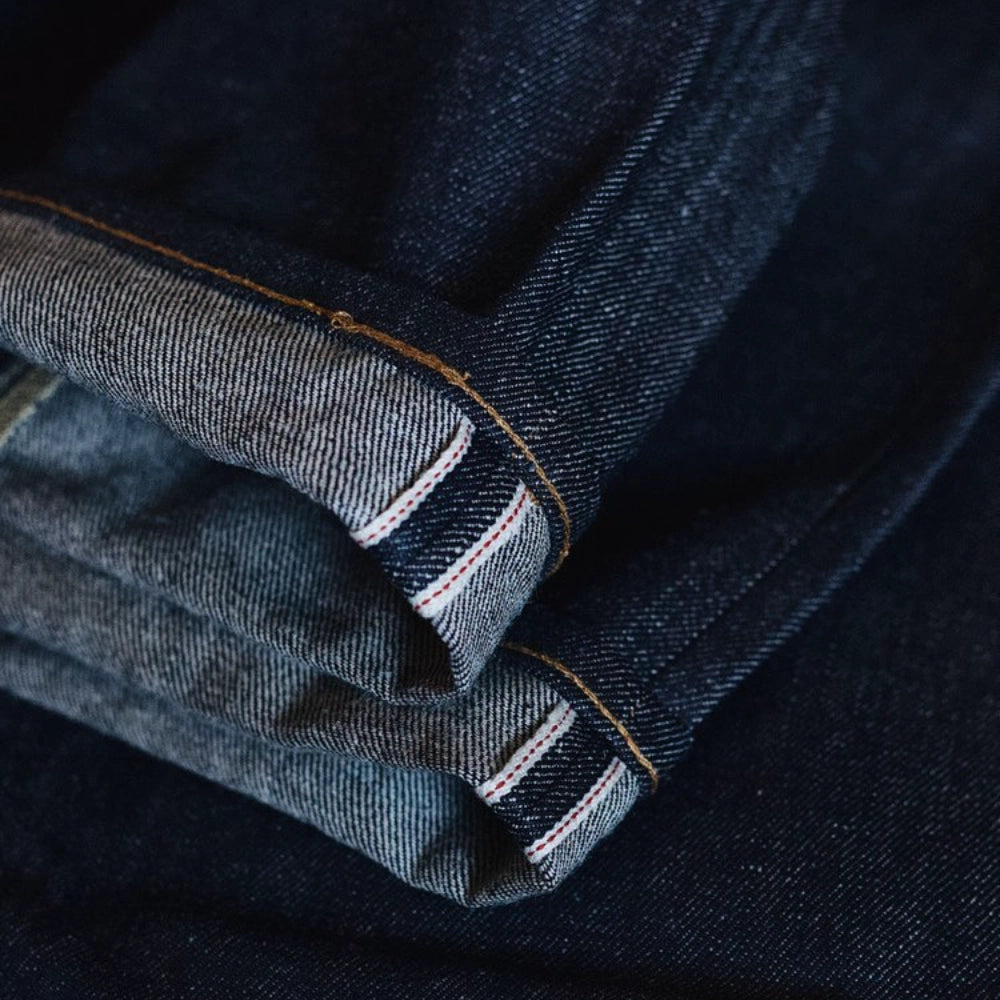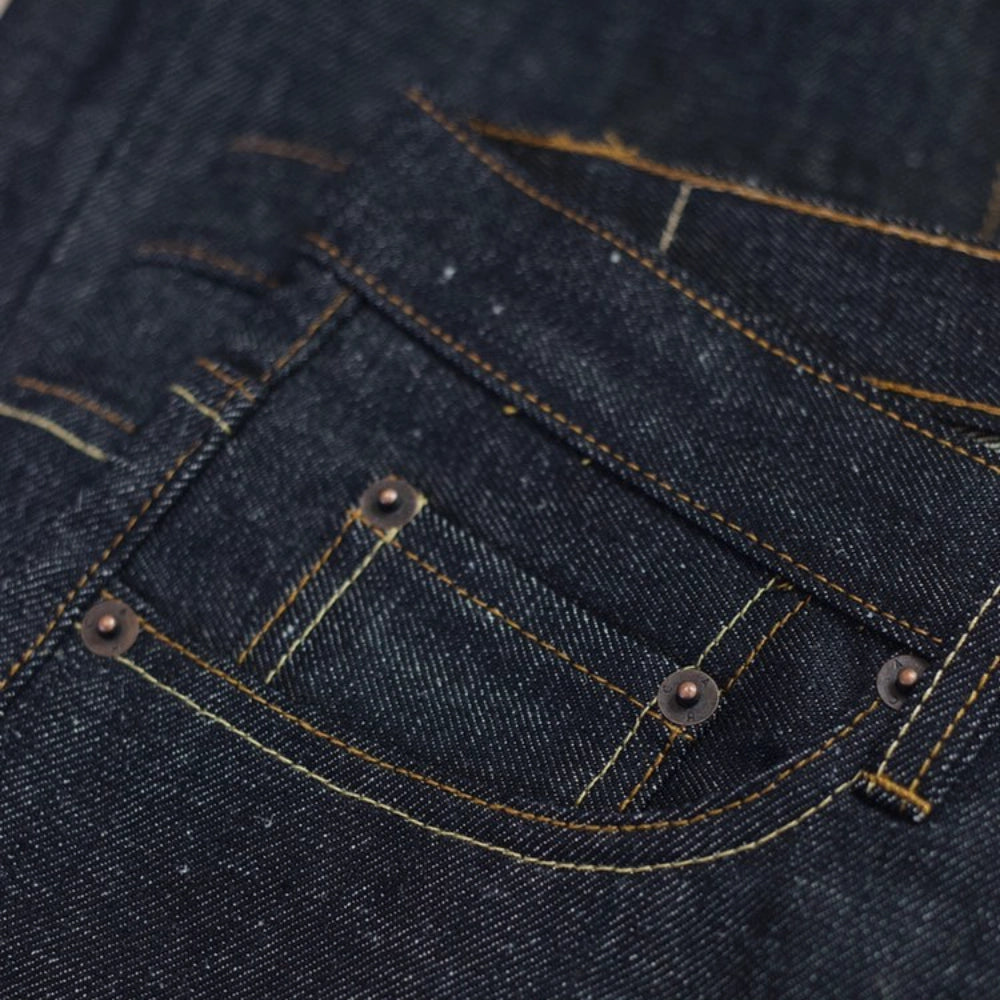 Premium raw 13.5oz selvedge denim; indigo blue-black hue