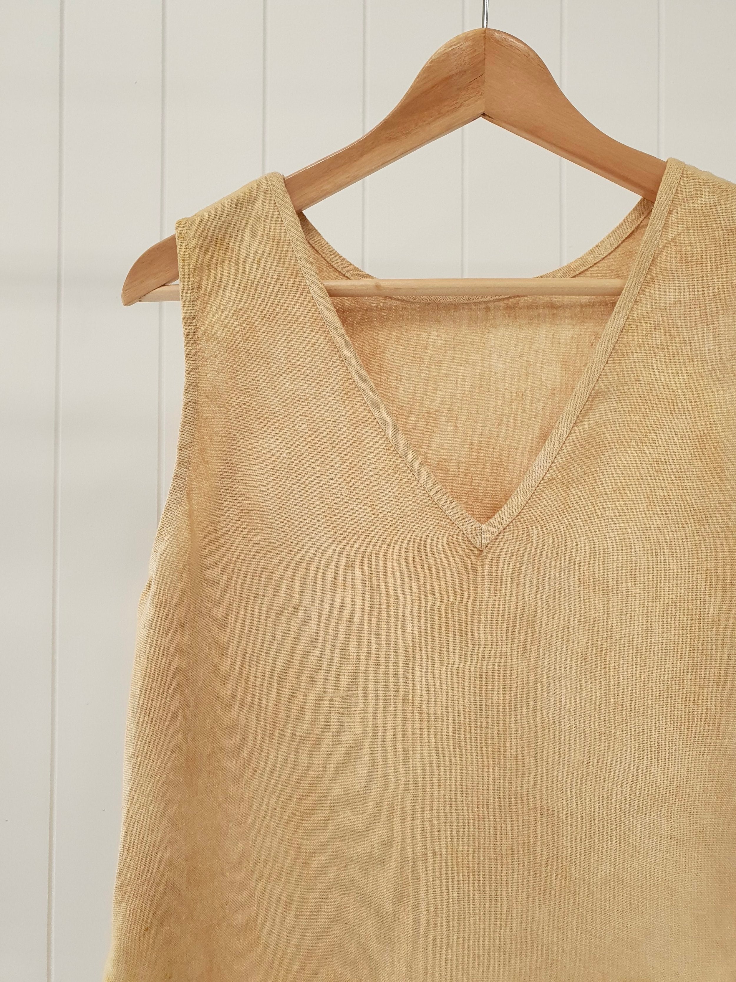 A bespoke piece, hand-dyed by botanical dye artist, Phoebe Hunter. This one-of-a-kind 100% hemp Maxi Dress has been dyed with pomegranate rinds.