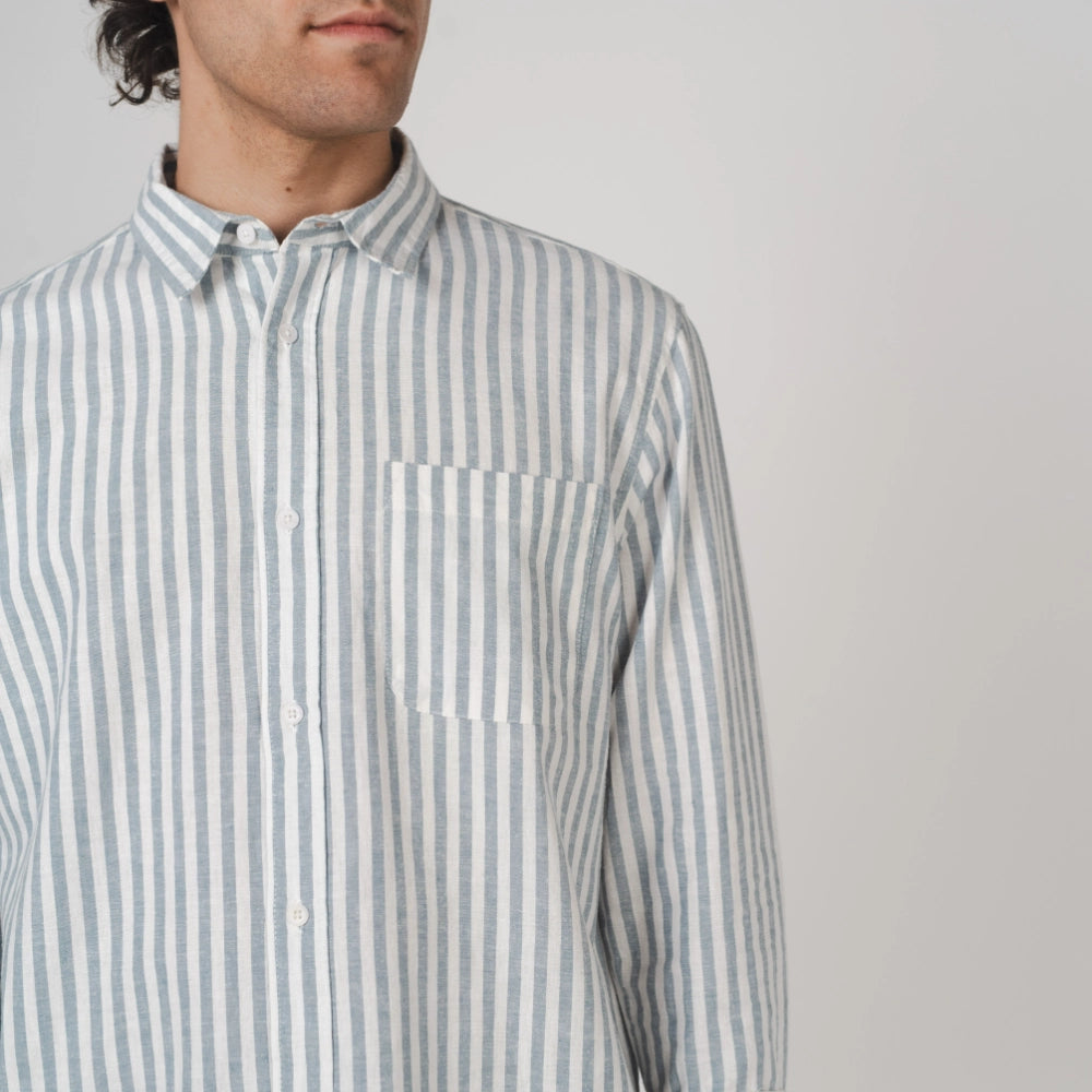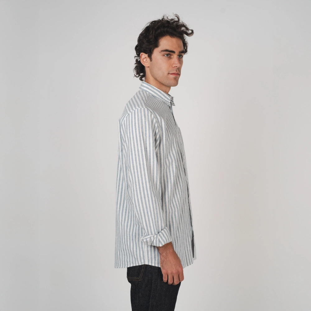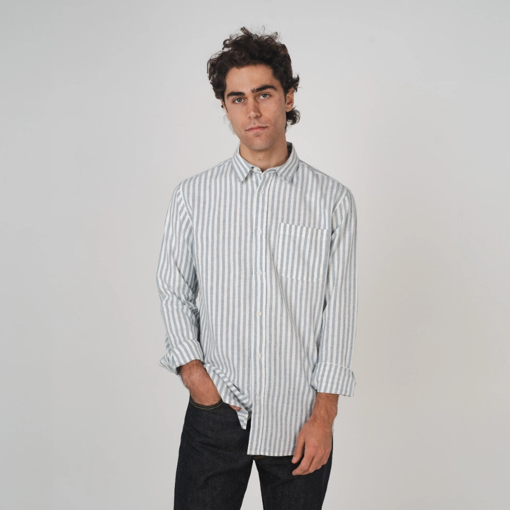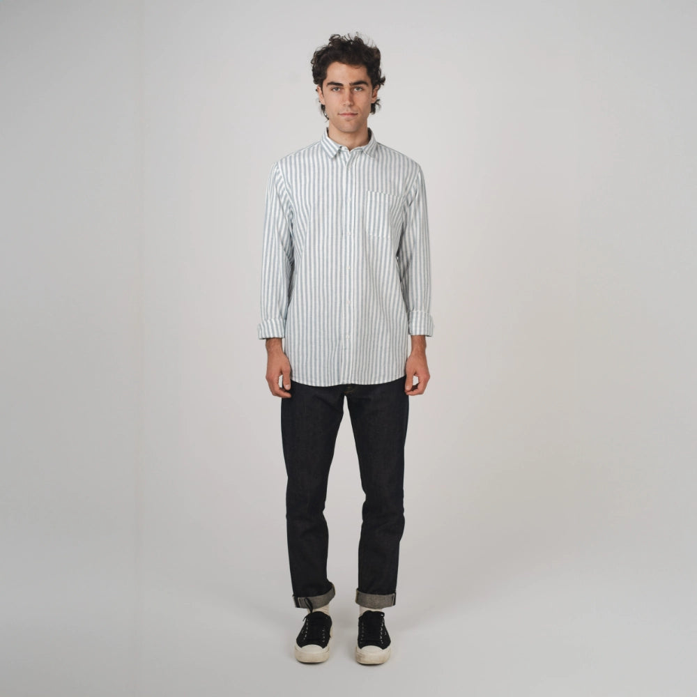 Our men’s Newtown Long Sleeve Shirt is a modern, lightweight shirting staple. Our custom stripe design is crafted from yarn-dyed hemp and organic cotton. Perfect for daytime casual or evening styling, the Newtown is designed for wearability and versatility.