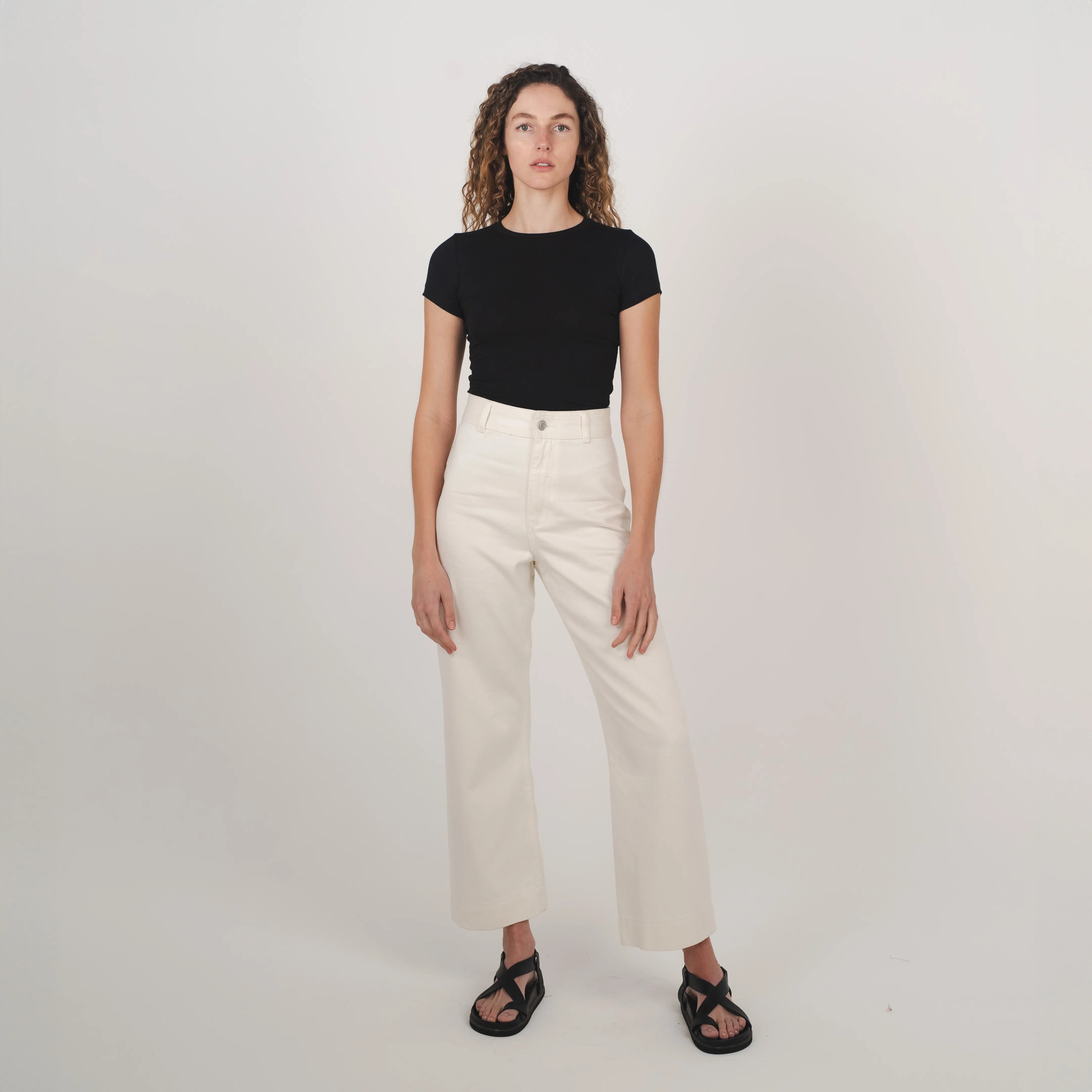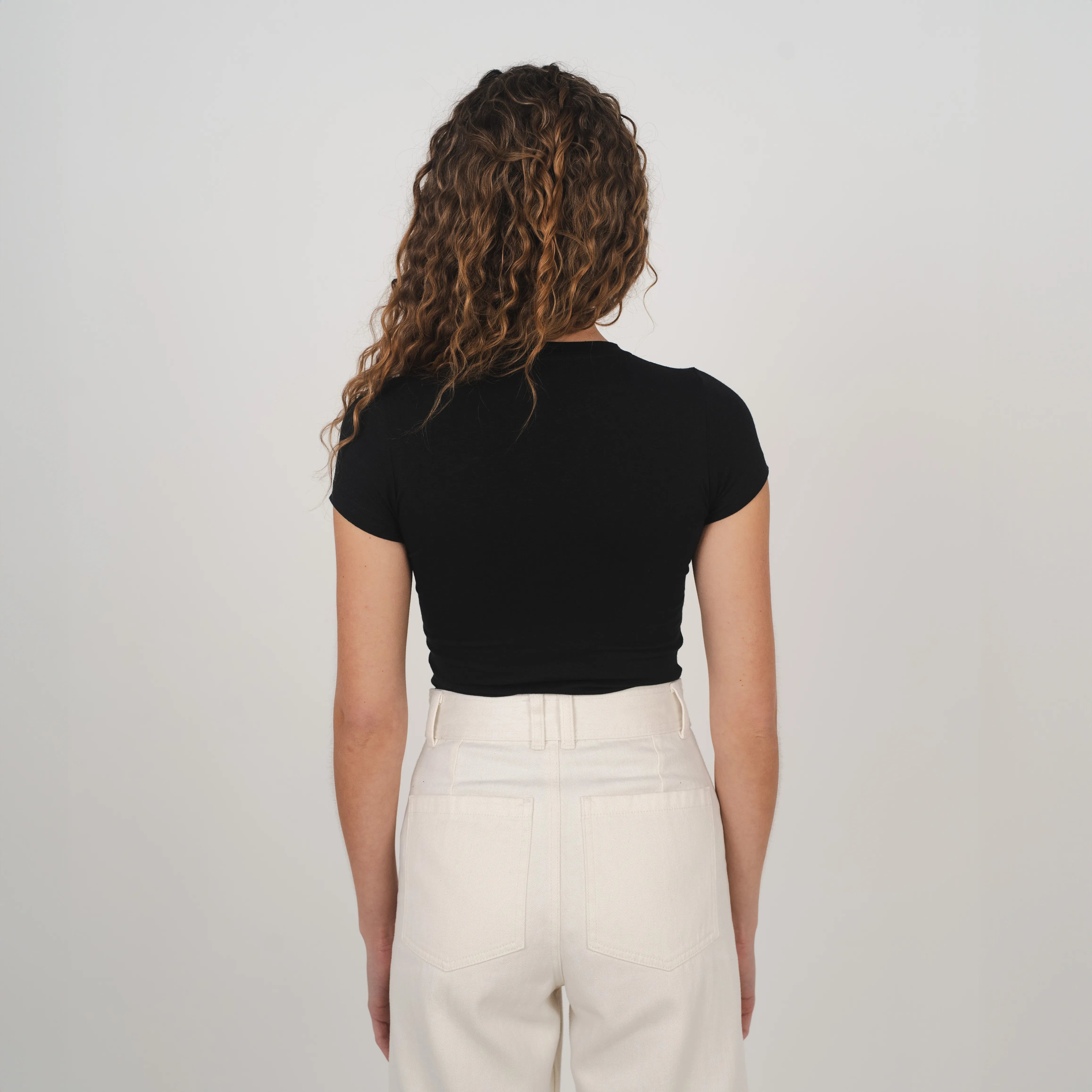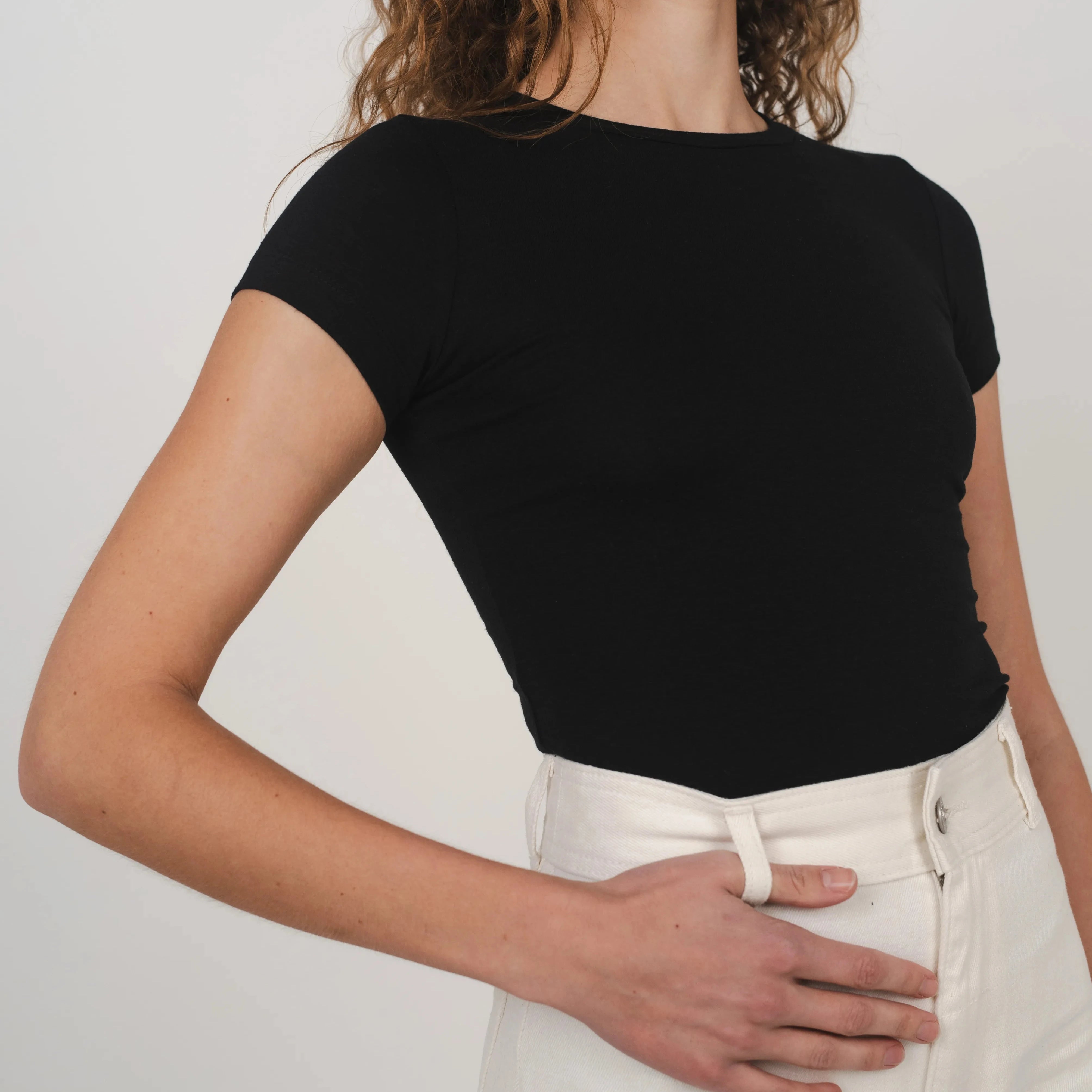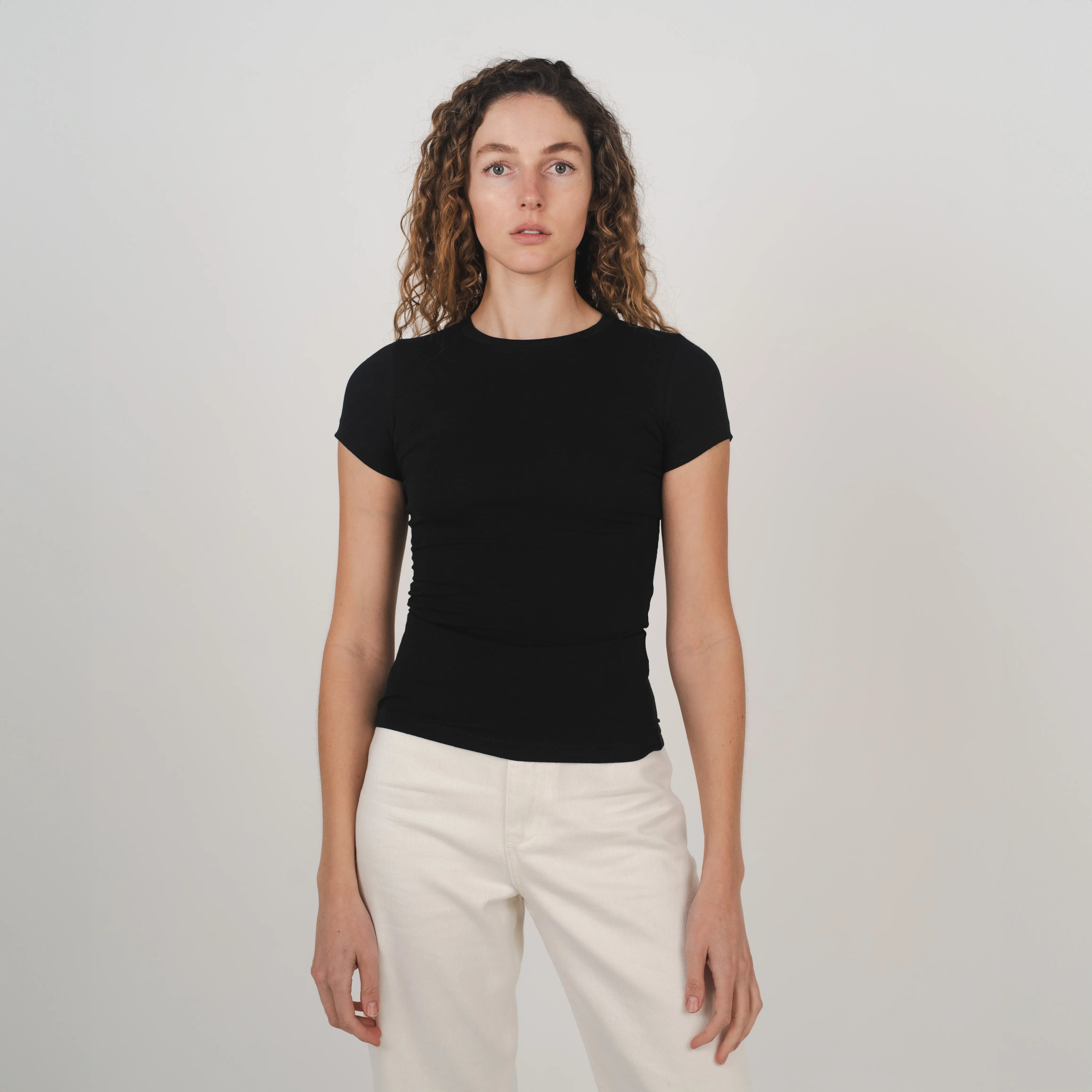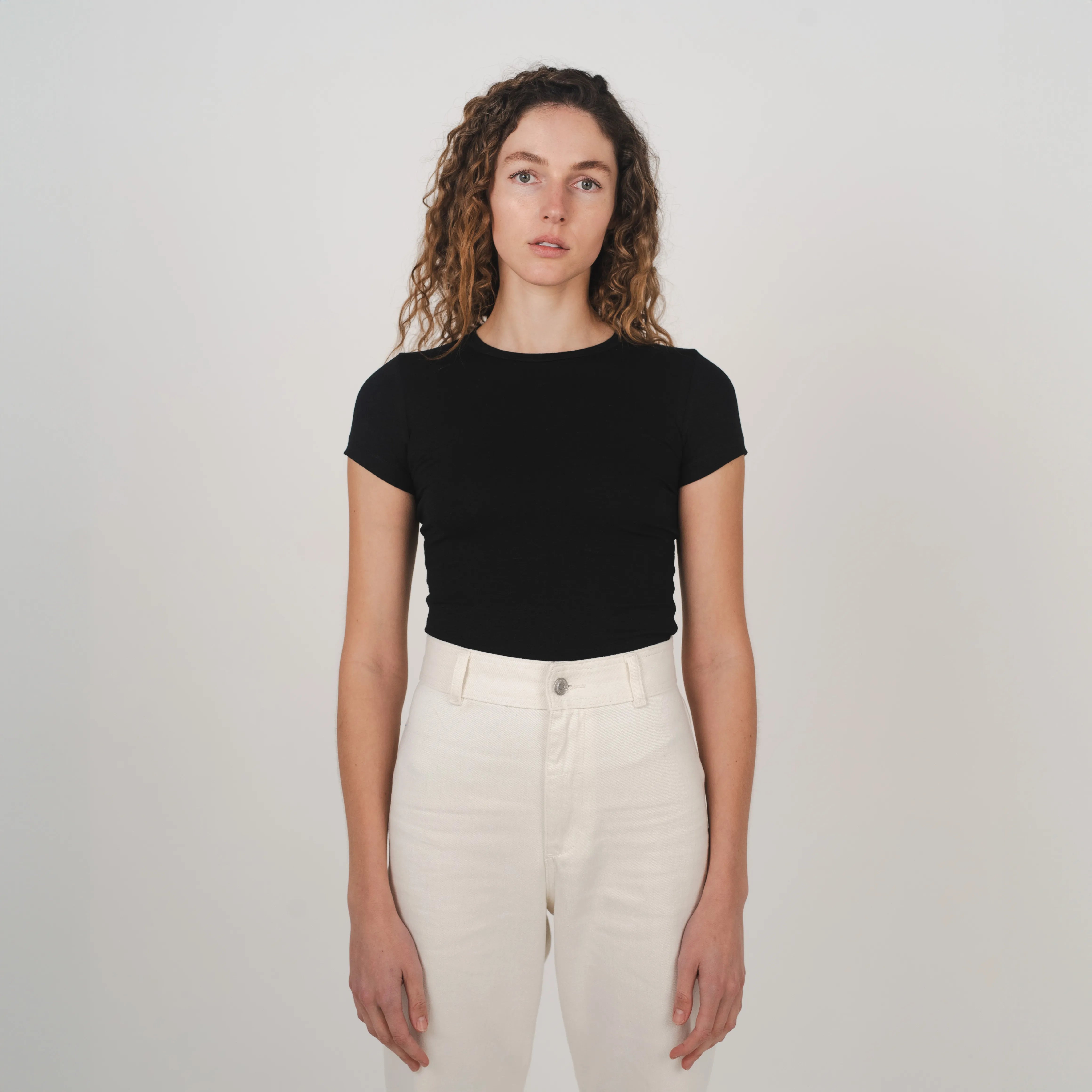 Our short-sleeve fitted tee is a classic design for everyday wear, featuring a crew neck and long line length. Made from a breathable, mid-weight hemp and organic cotton with 5% spandex for added stretch, it contours in all the right places.