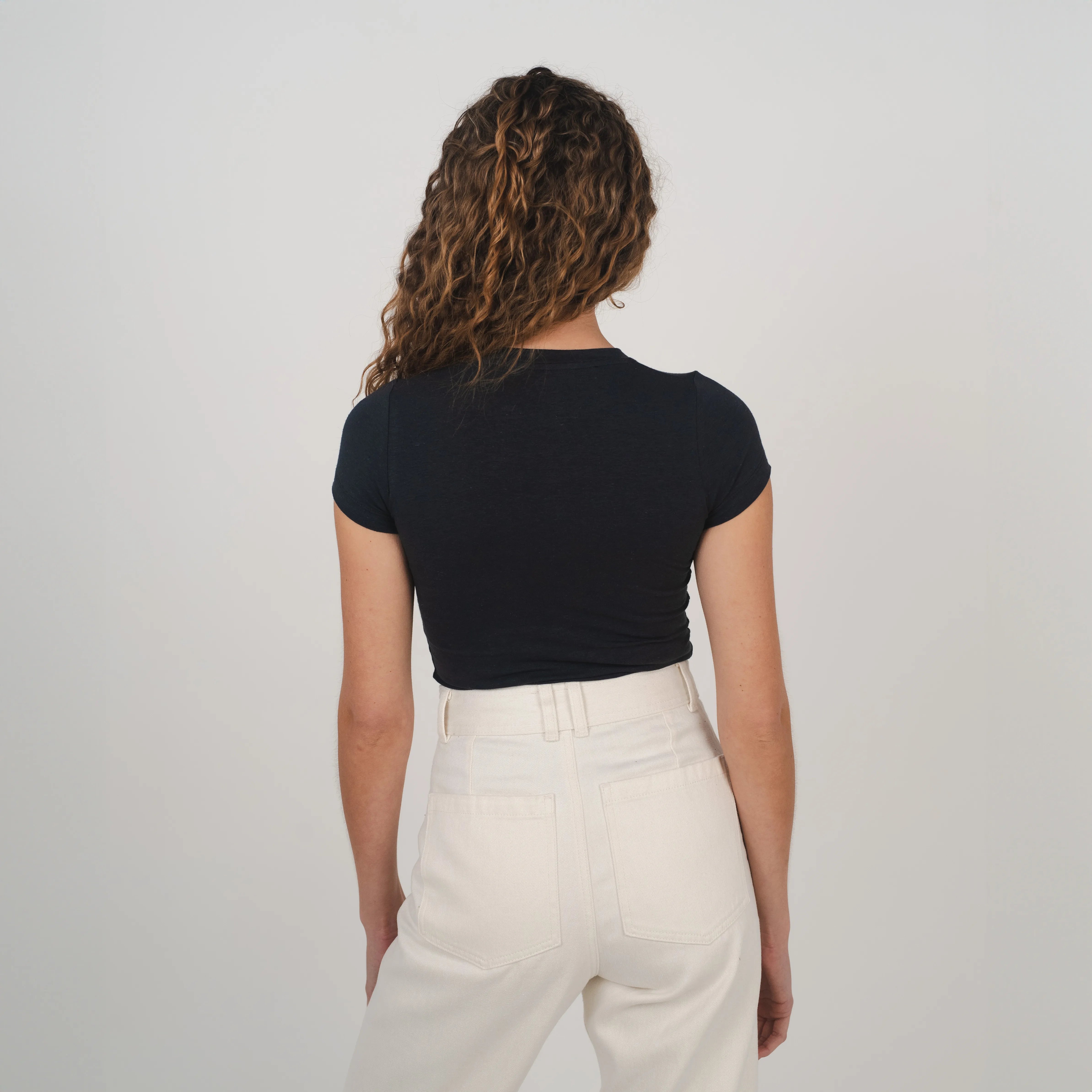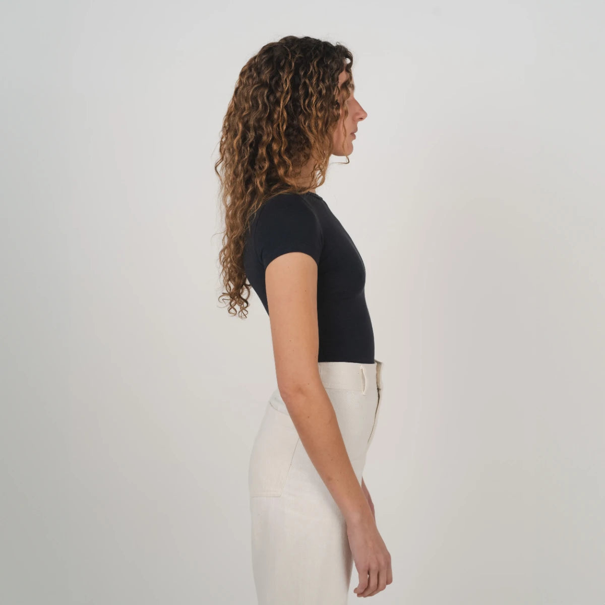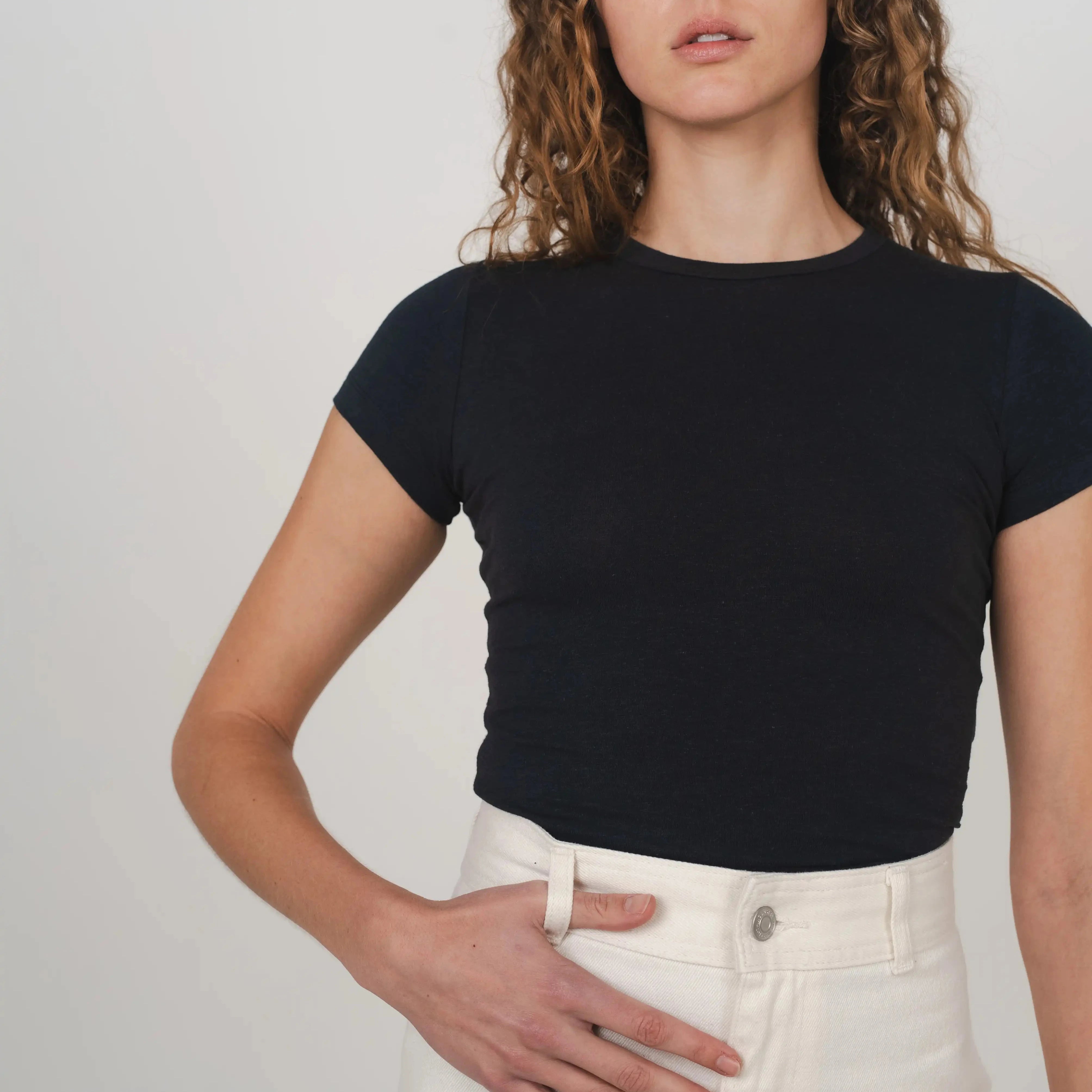 Our short-sleeve fitted tee is a classic design for everyday wear, featuring a crew neck and long line length. Made from a breathable, mid-weight hemp and organic cotton with 5% spandex for added stretch, it contours in all the right places.