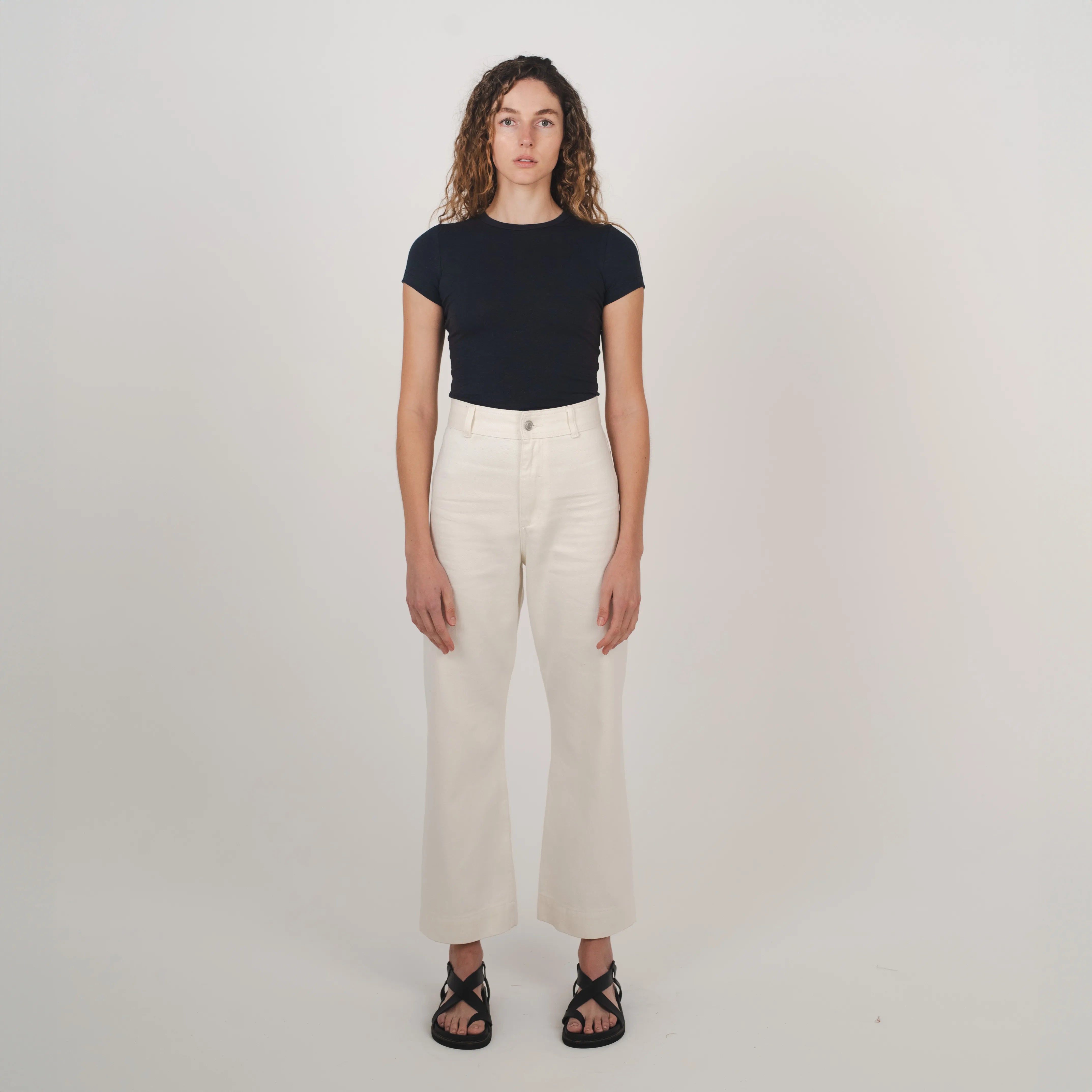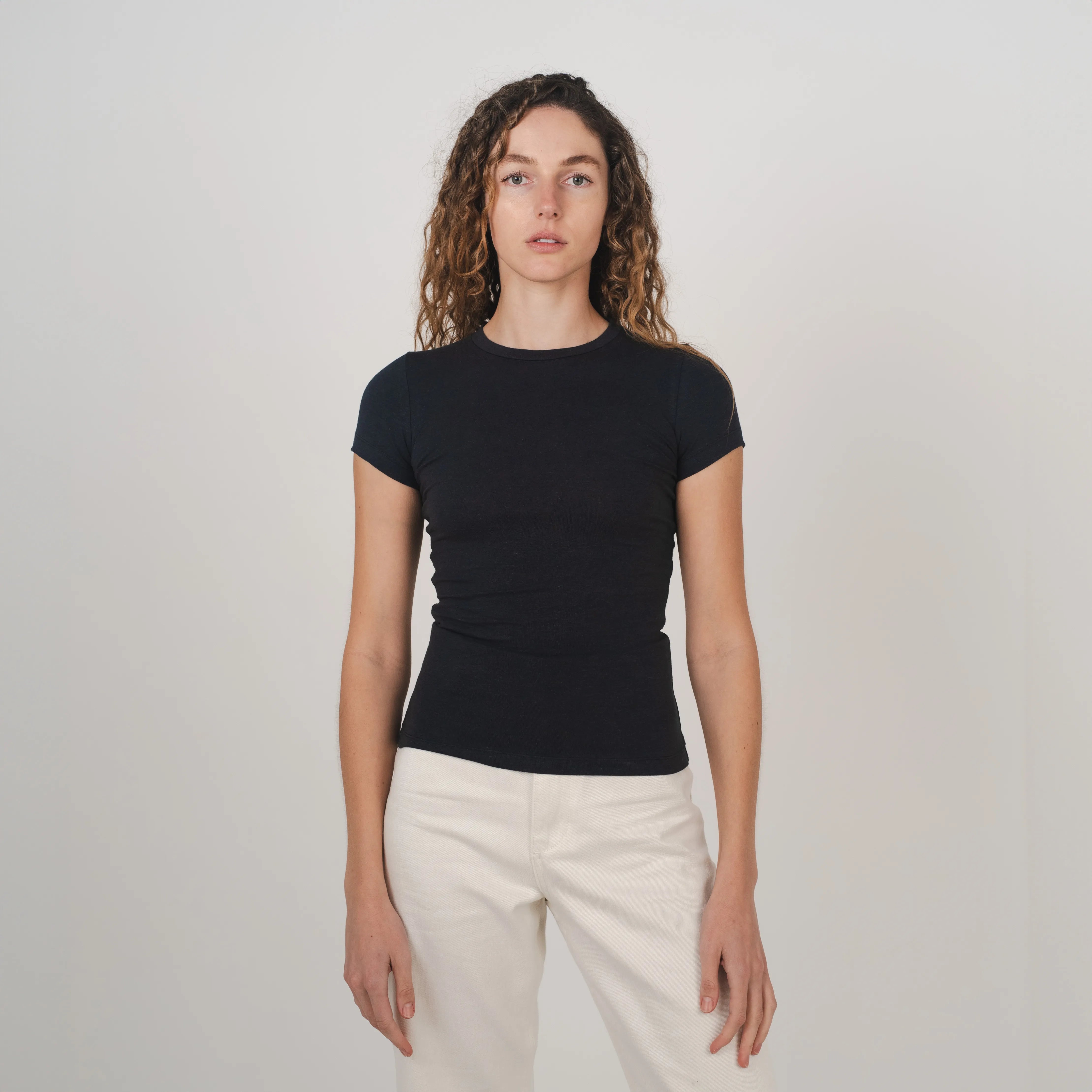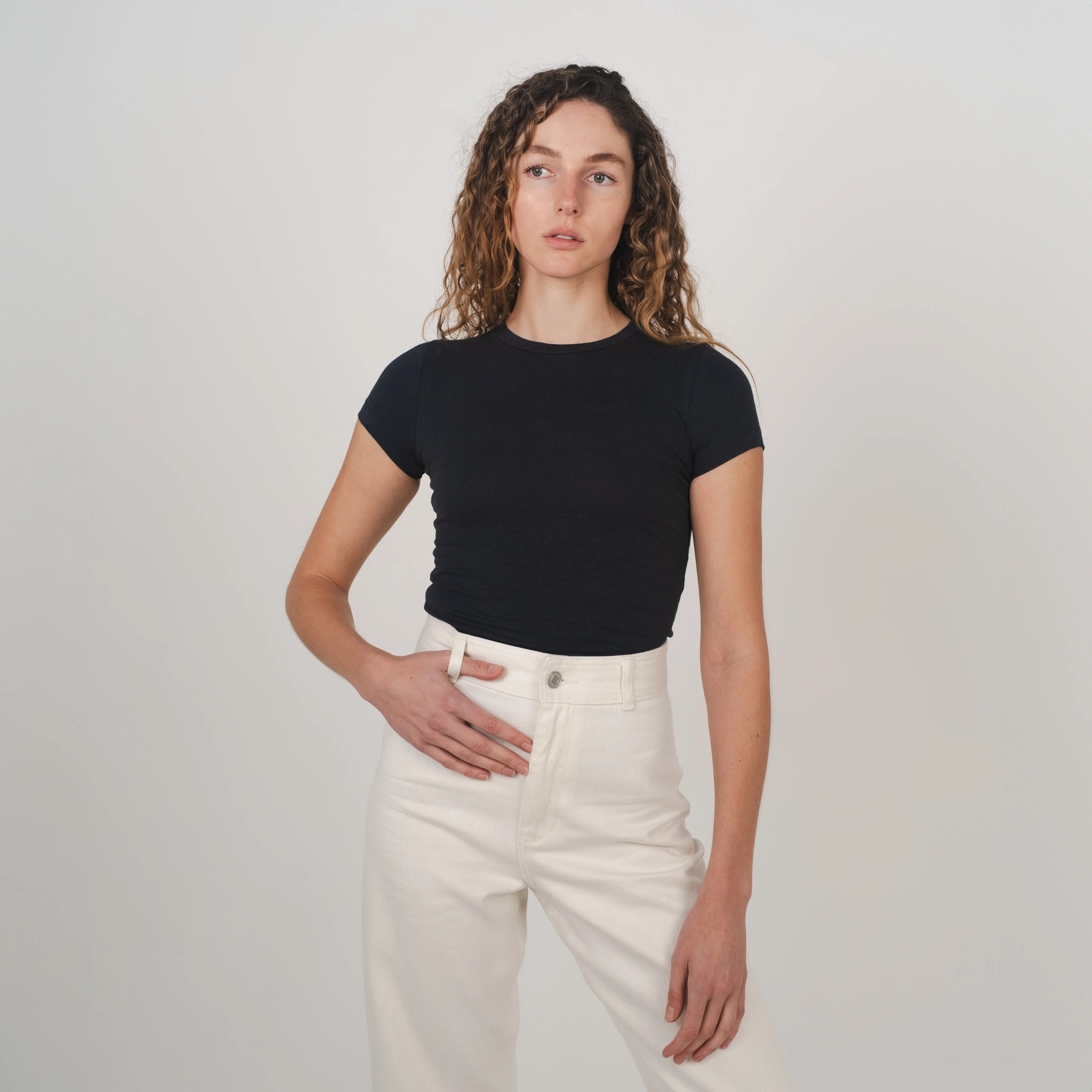 Our short-sleeve fitted tee is a classic design for everyday wear, featuring a crew neck and long line length. Made from a breathable, mid-weight hemp and organic cotton with 5% spandex for added stretch, it contours in all the right places.