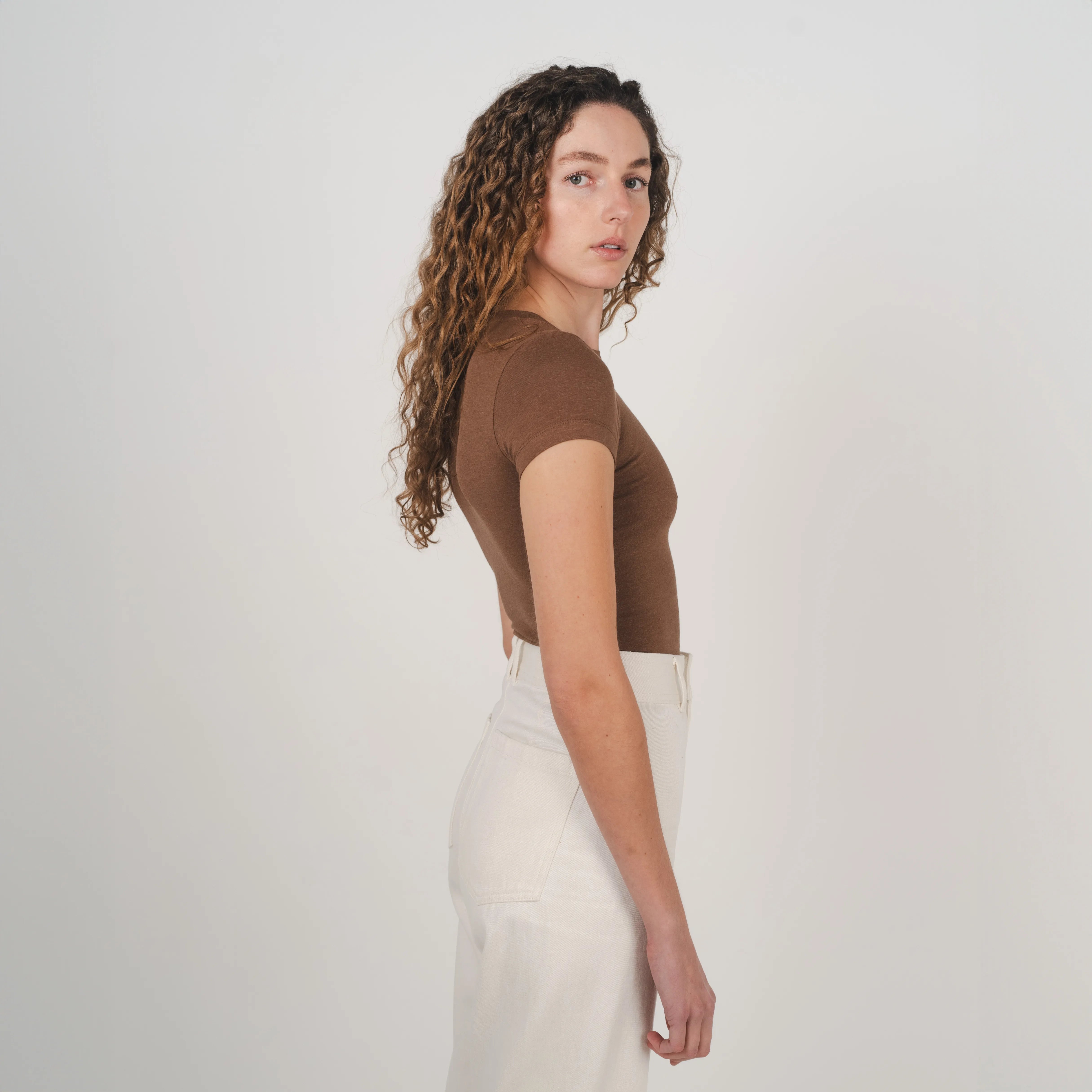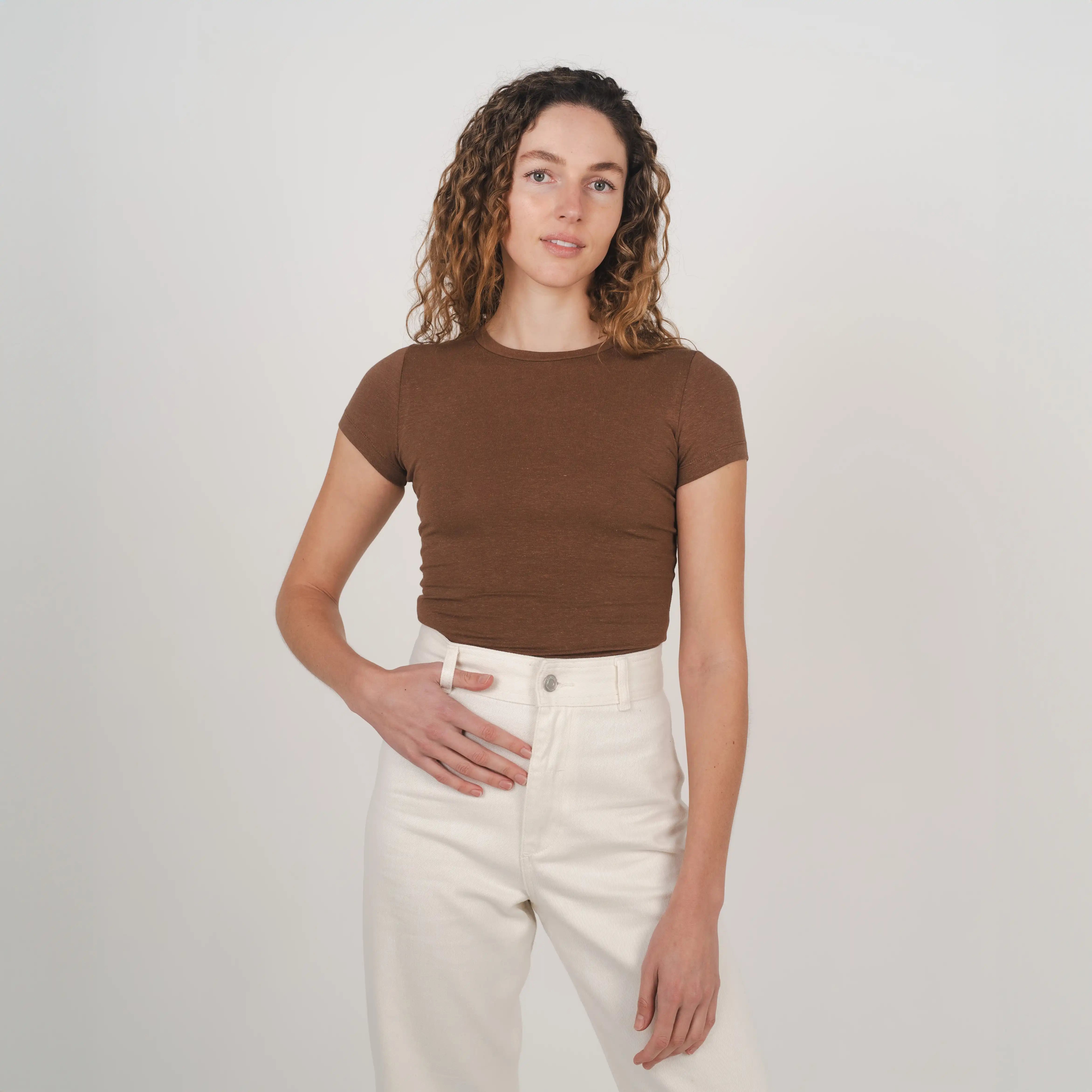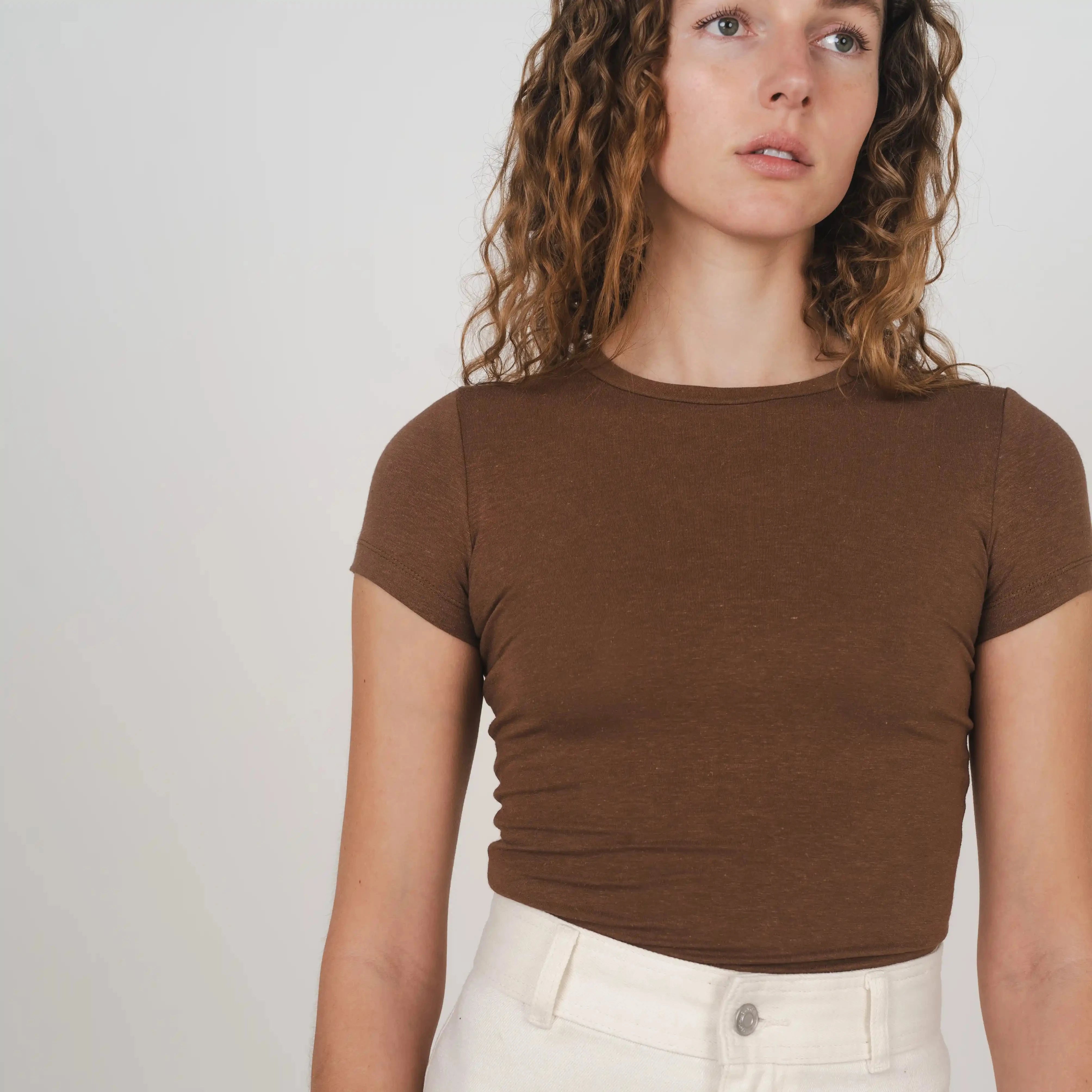 Our short-sleeve fitted tee is a classic design for everyday wear, featuring a crew neck and long line length. Made from a breathable, mid-weight hemp and organic cotton with 5% spandex for added stretch, it contours in all the right places.