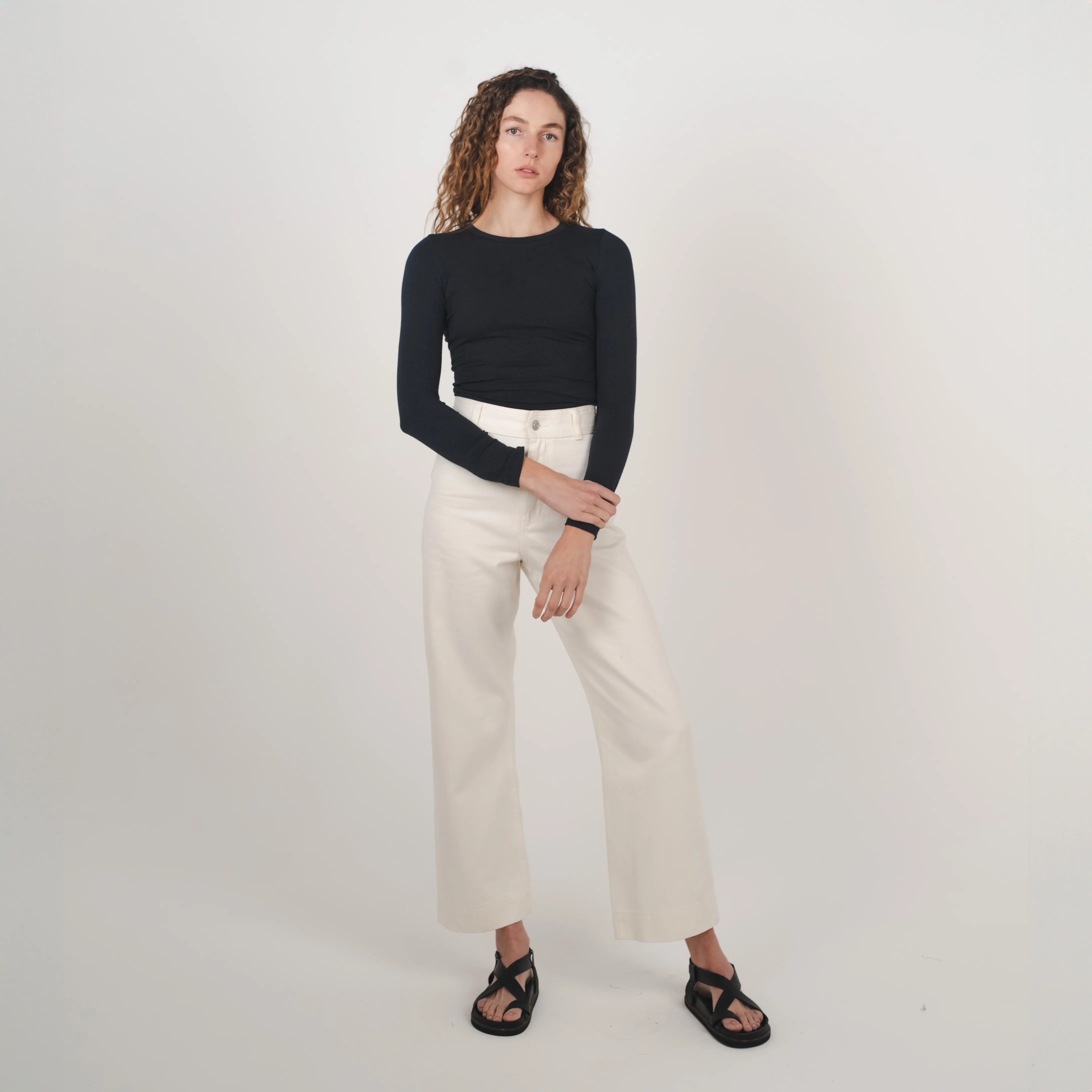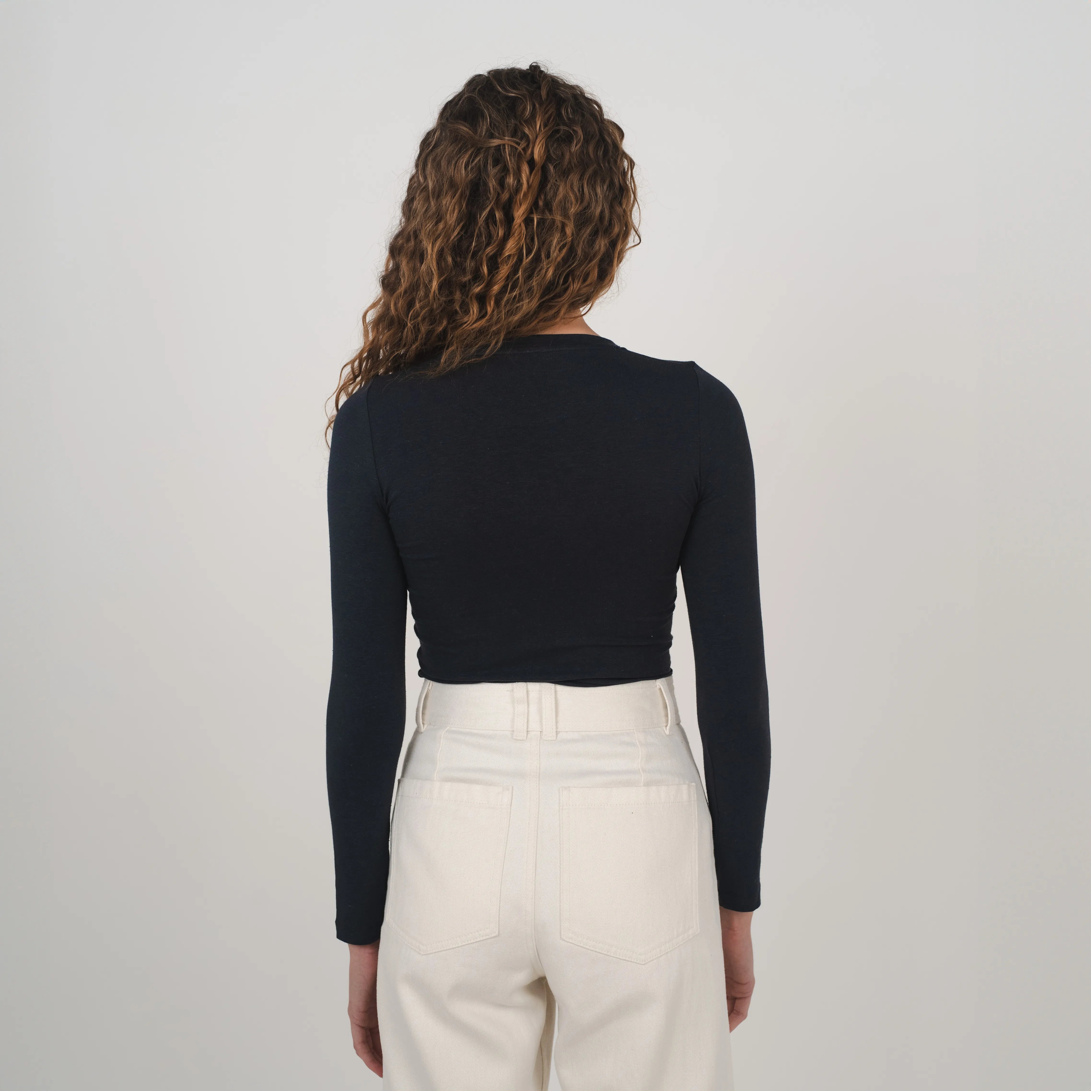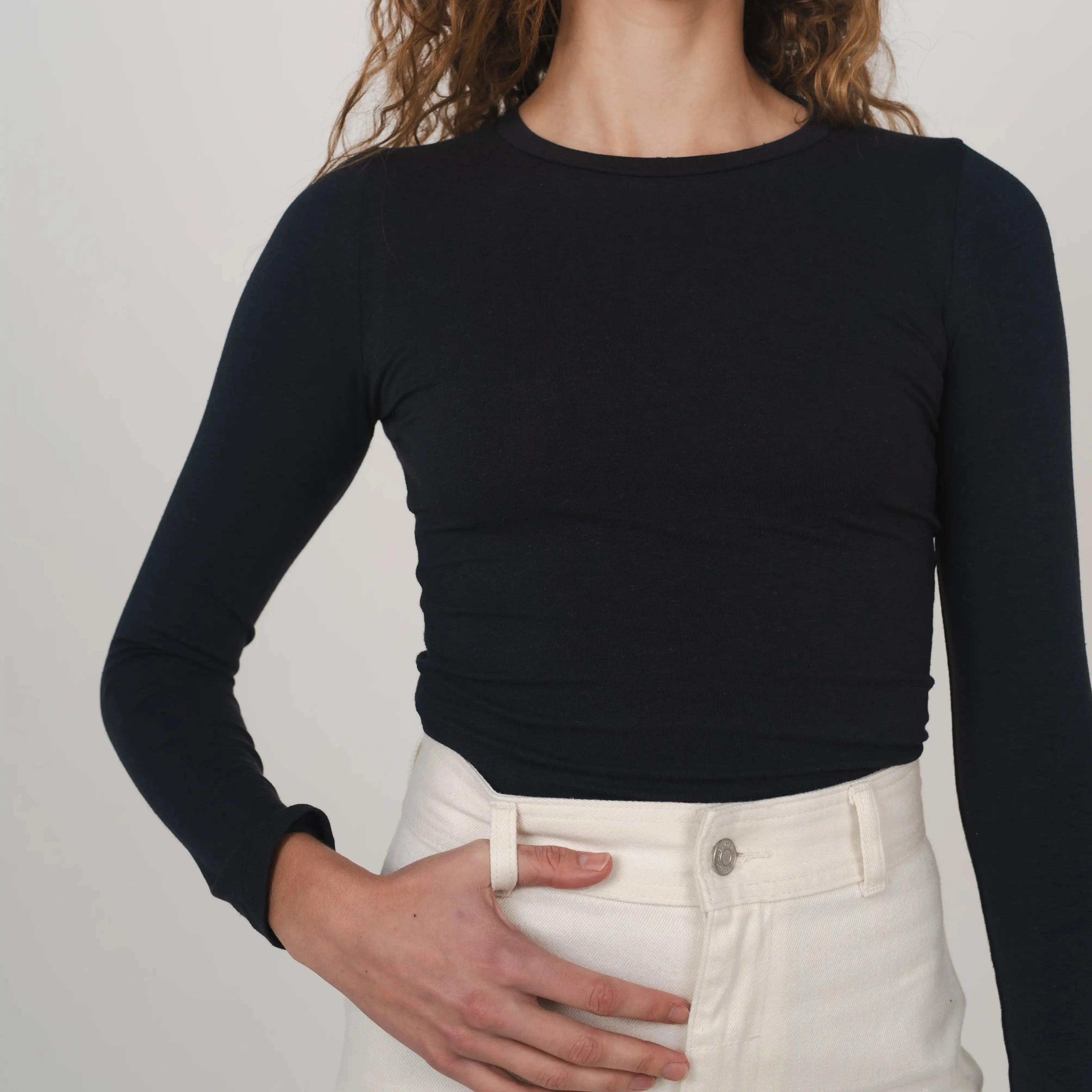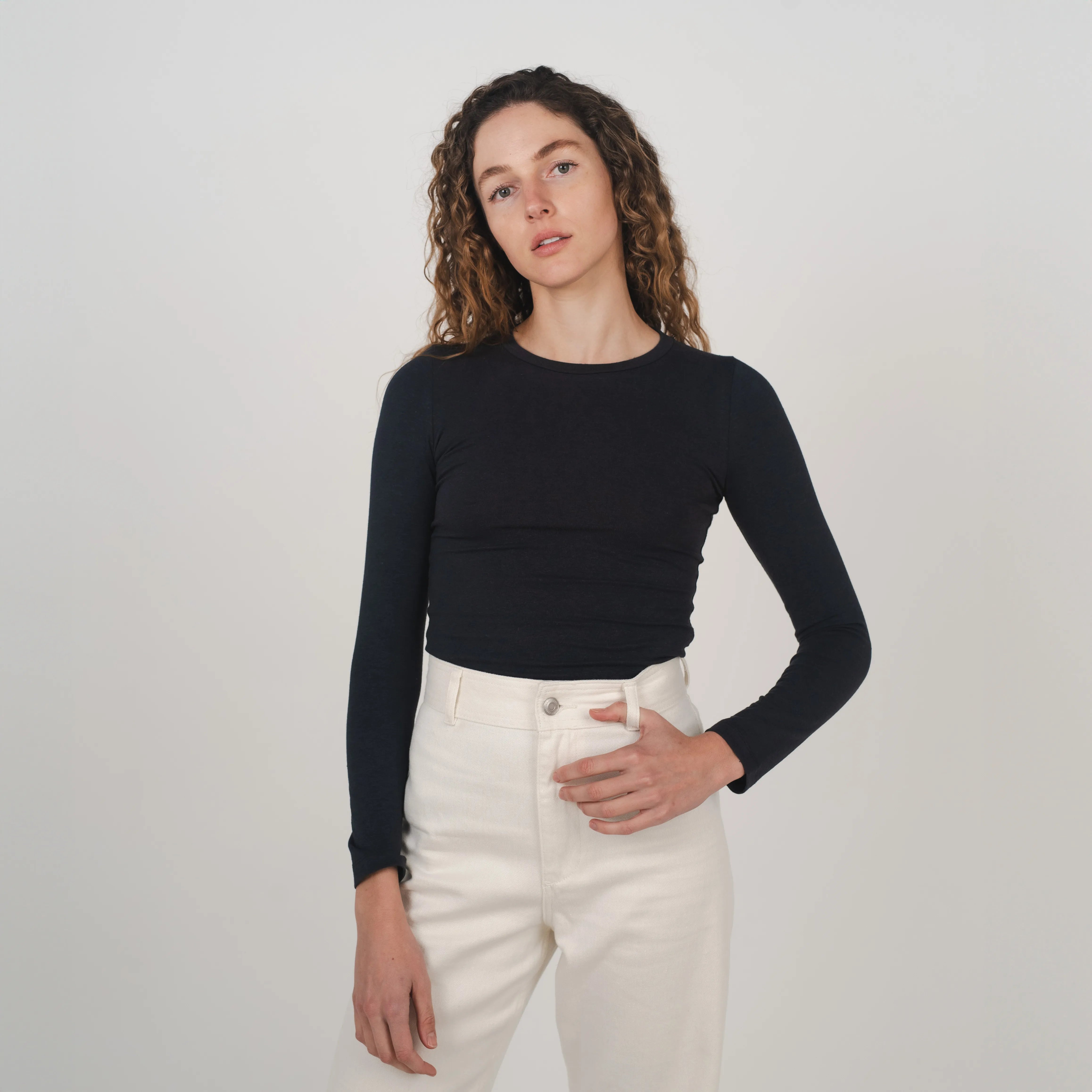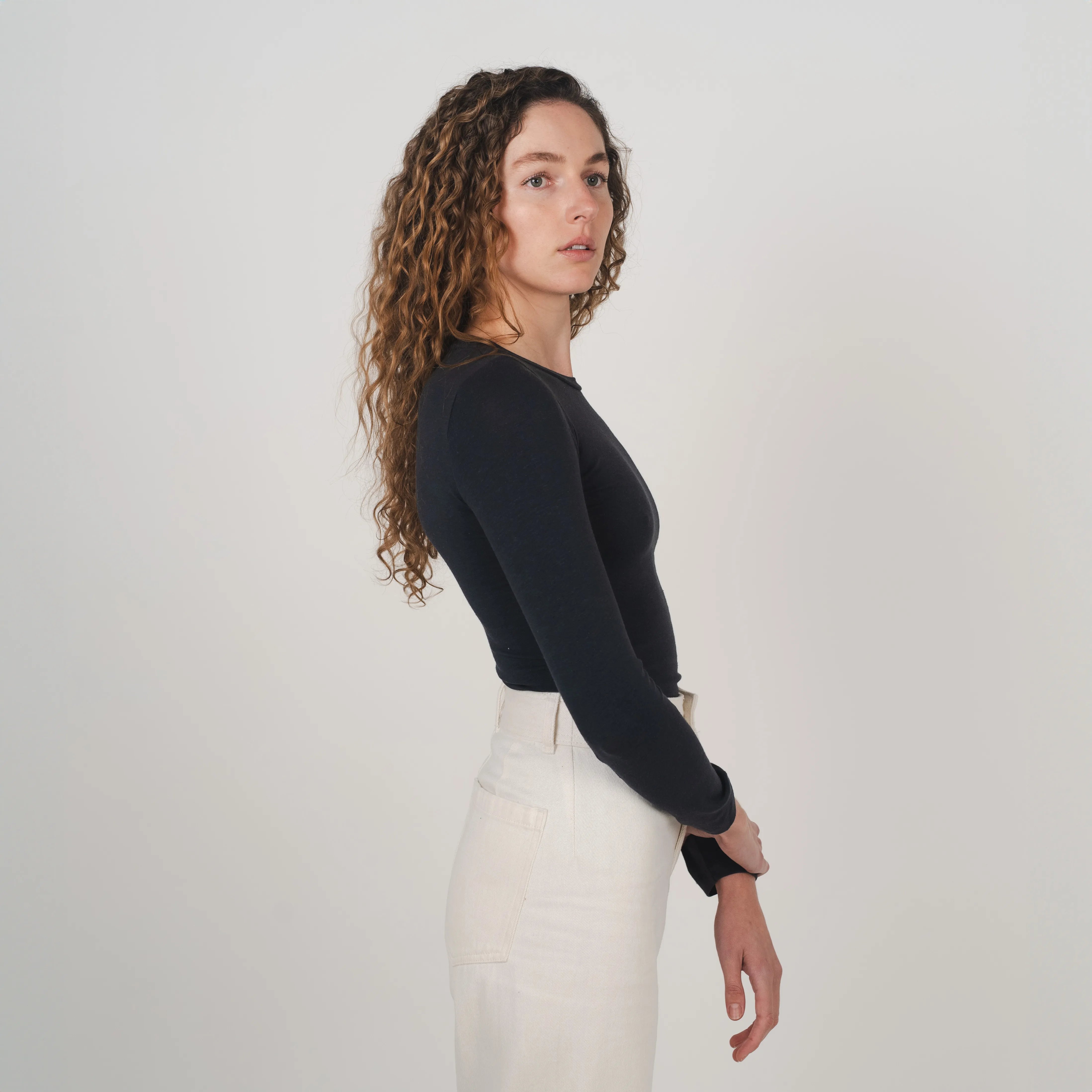 Our stretch long sleeve top is crafted from breathable hemp and organic cotton with 5% spandex for added stretch and comfort. Featuring a crew neck and long line length, it’s ideal for layering and designed for all day comfort.