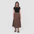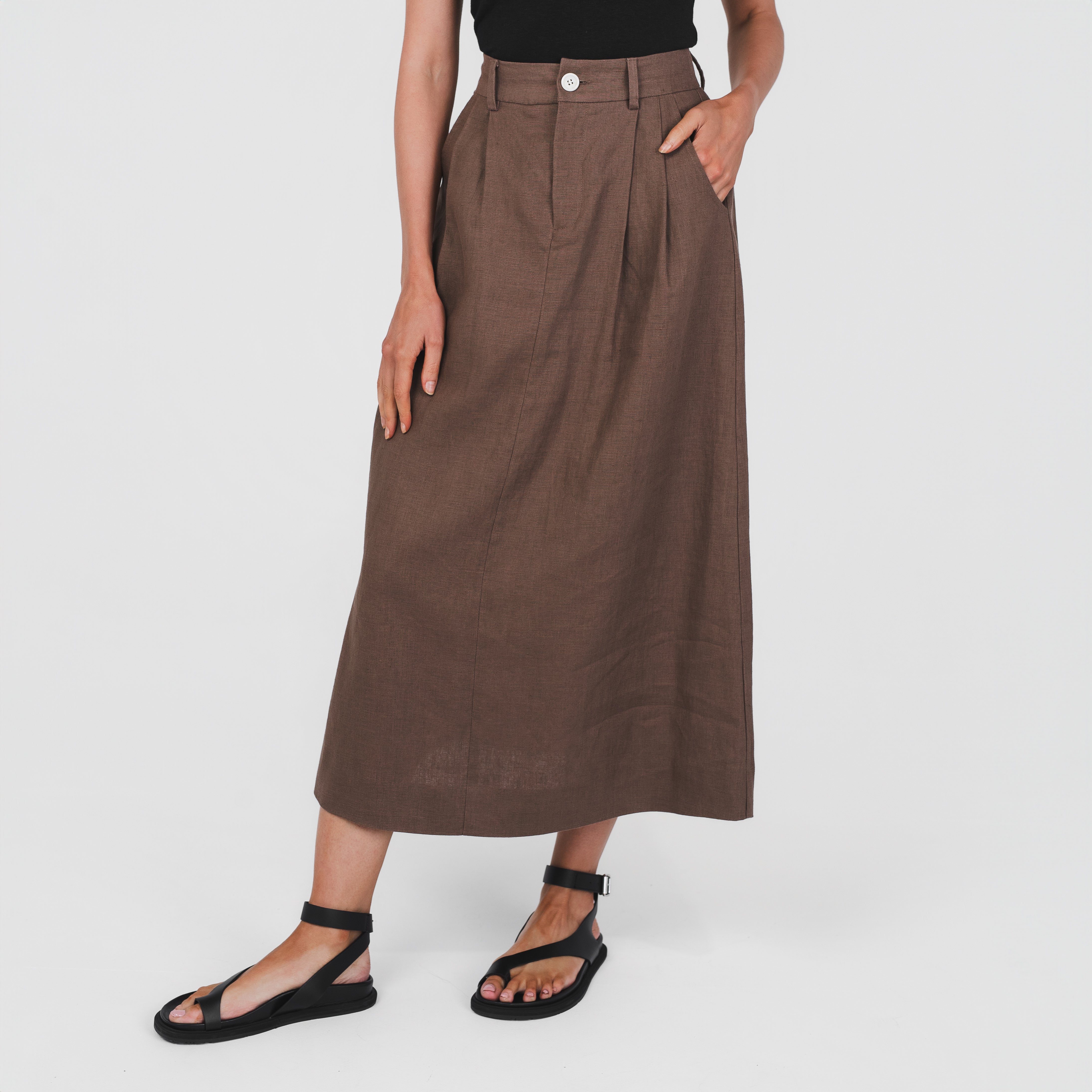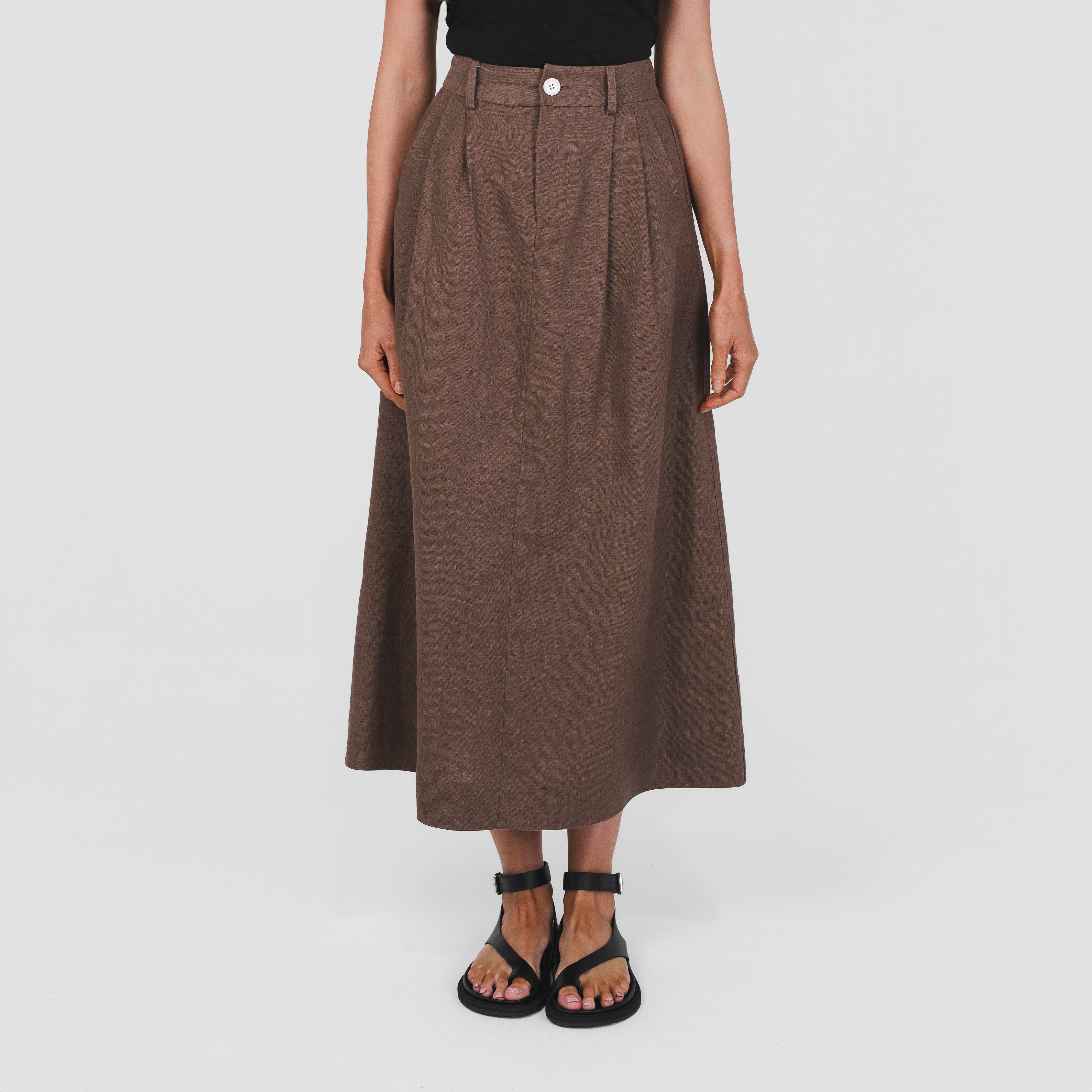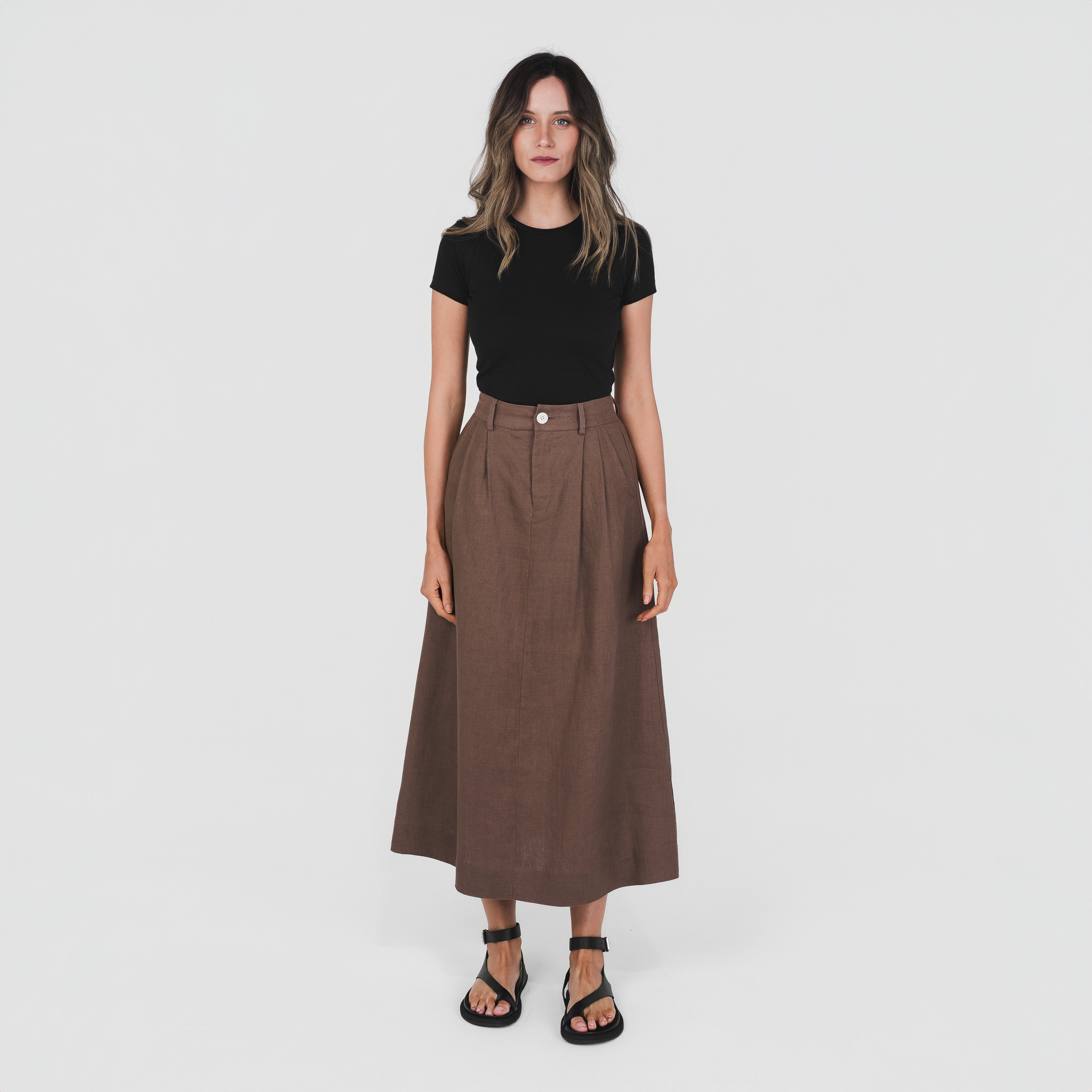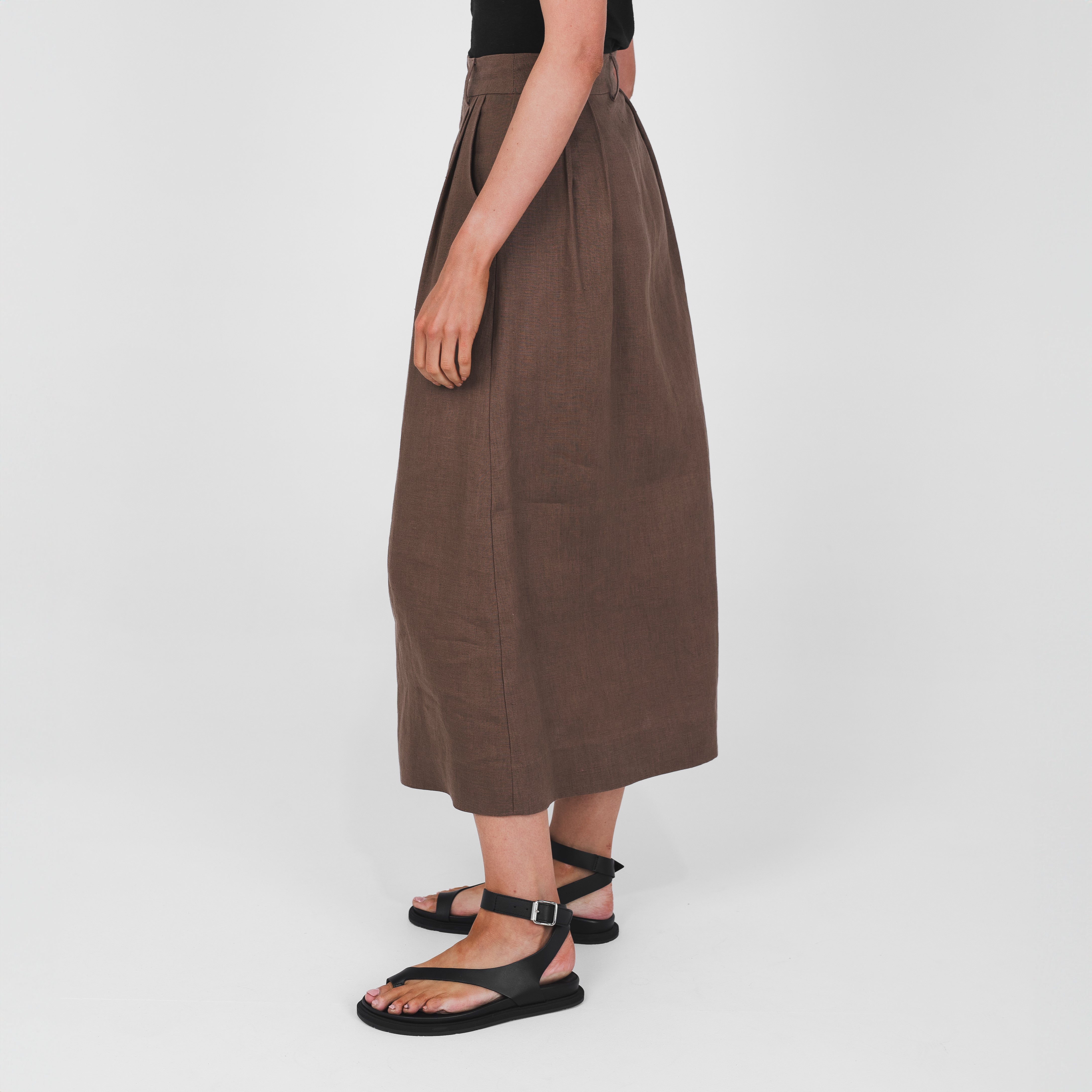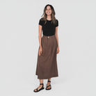 Crafted from pure 100% hemp, the Tailored Skirt combines structure with a soft, natural texture. It features a high waist, front pleats, and an A-line silhouette that falls to a flattering midi length. Finished with belt loops and side seam pockets for everyday functionality. It’s a versatile, timeless piece made for everyday wear; day to night, work to weekend.